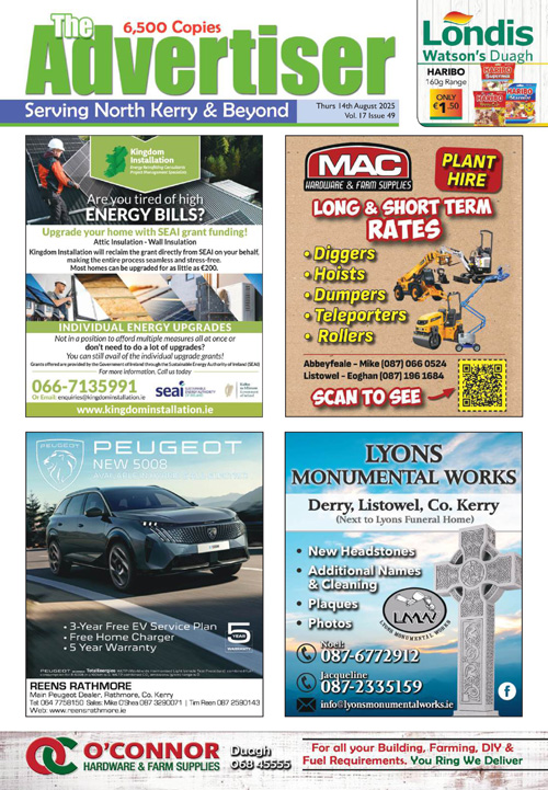 The Advertiser is a free magazine distributed throughout the greater North Kerry area and parts of West Limerick.