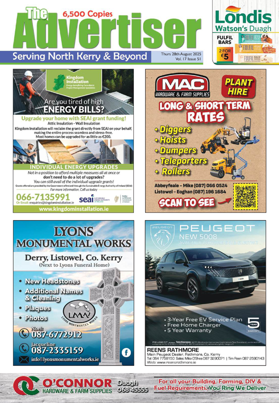 The Advertiser is a free magazine distributed throughout the greater North Kerry area and parts of West Limerick.