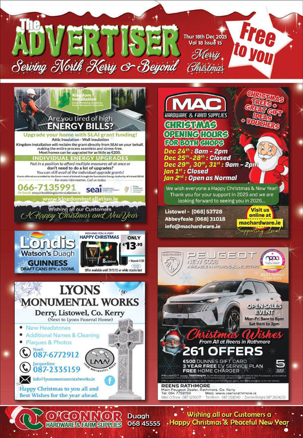The Advertiser is a free magazine distributed throughout the greater North Kerry area and parts of West Limerick.