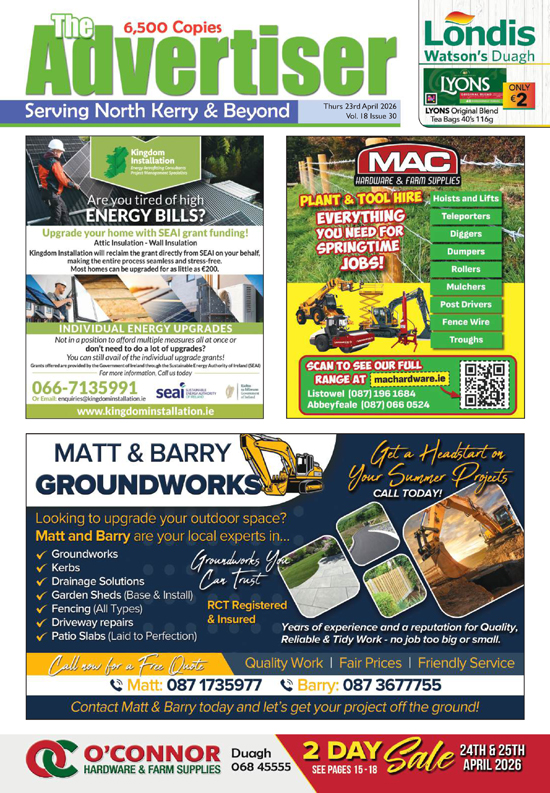 The Advertiser is a free magazine distributed throughout the greater North Kerry area and parts of West Limerick.