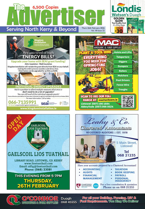 The Advertiser is a free magazine distributed throughout the greater North Kerry area and parts of West Limerick.